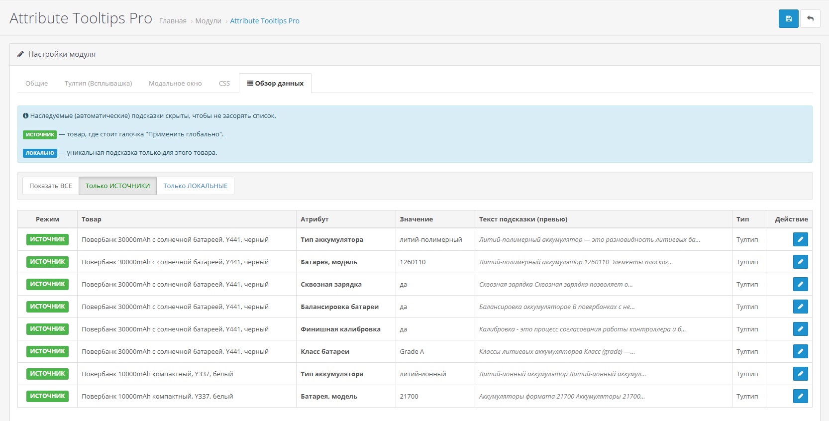 - Глобальный режим: Задайте описание для значения "Li-Ion" один раз — и оно появится у всех товаров с таким аккумулятором.