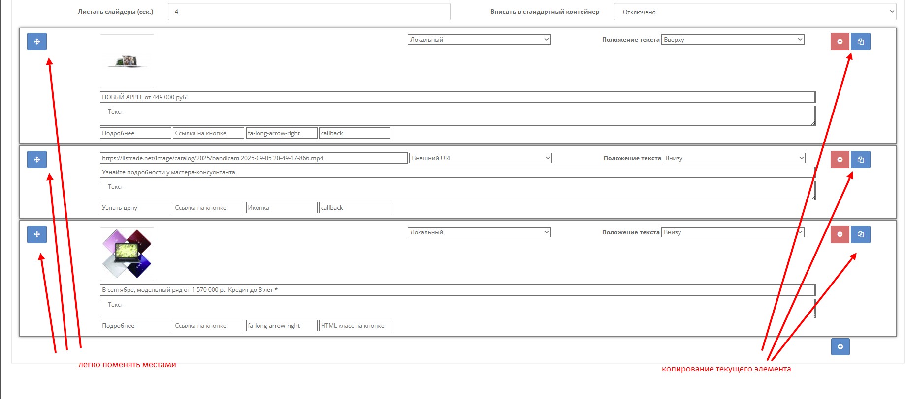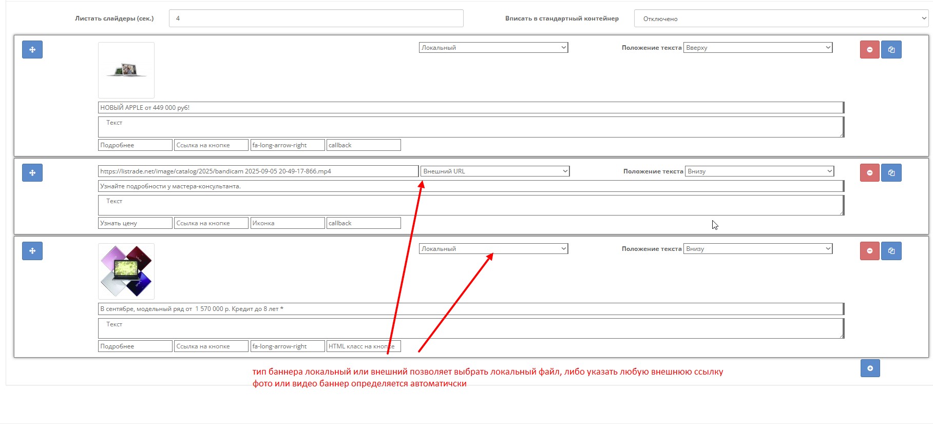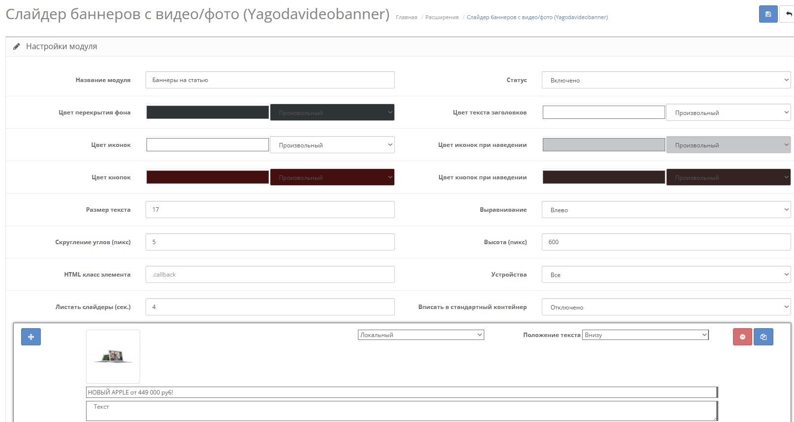 Модуль позволяет легко создать слайдер баннеров с фото или видео, с текстом (заголовок + текст), и с кнопкой (выбрать цвет, цвет при наведении, текст, иконку, html класс и ссылку). Слайдер адаптируется под мобильные устройства, а также может быть настроен к показу только на выбранном типе устройств.
