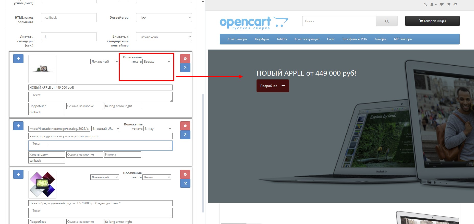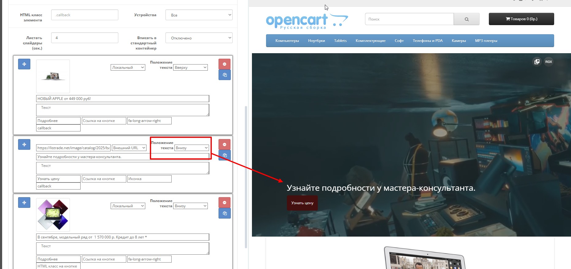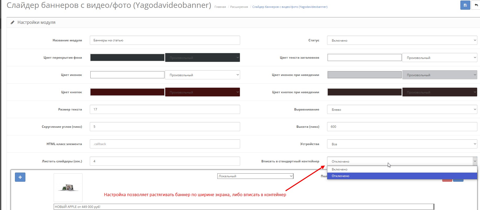 Модуль позволяет легко создать слайдер баннеров с фото или видео, с текстом (заголовок + текст), и с кнопкой (выбрать цвет, цвет при наведении, текст, иконку, html класс и ссылку). Слайдер адаптируется под мобильные устройства, а также может быть настроен к показу только на выбранном типе устройств.