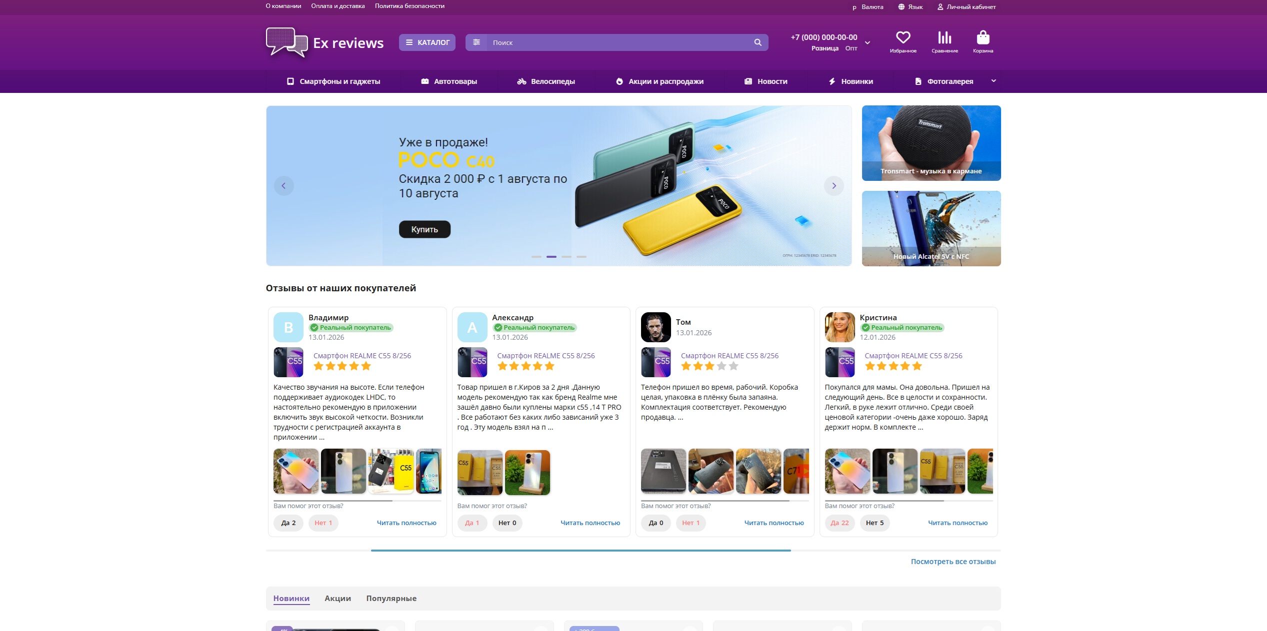4) Карусель отзывов о товарах (можно выводить последние/случайные/полезные отзывы):