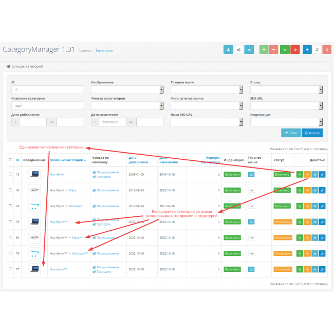 при копировании категорий полностью копируется вся их информация, включая описание, фильтры, схемы, назначенные магазины и тд (за исключением привязанных товаров и seourl)