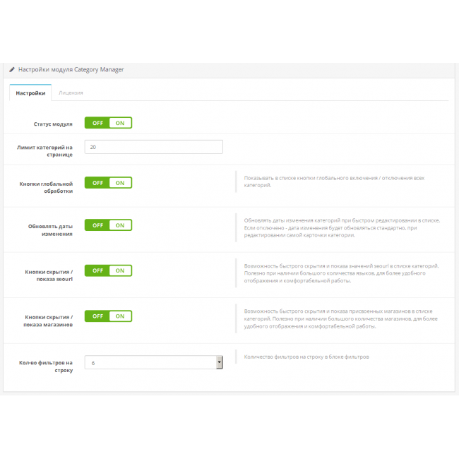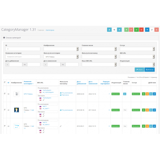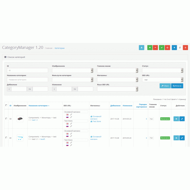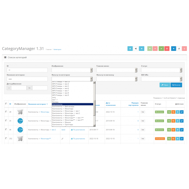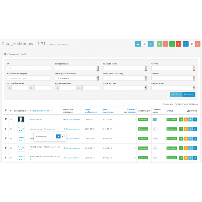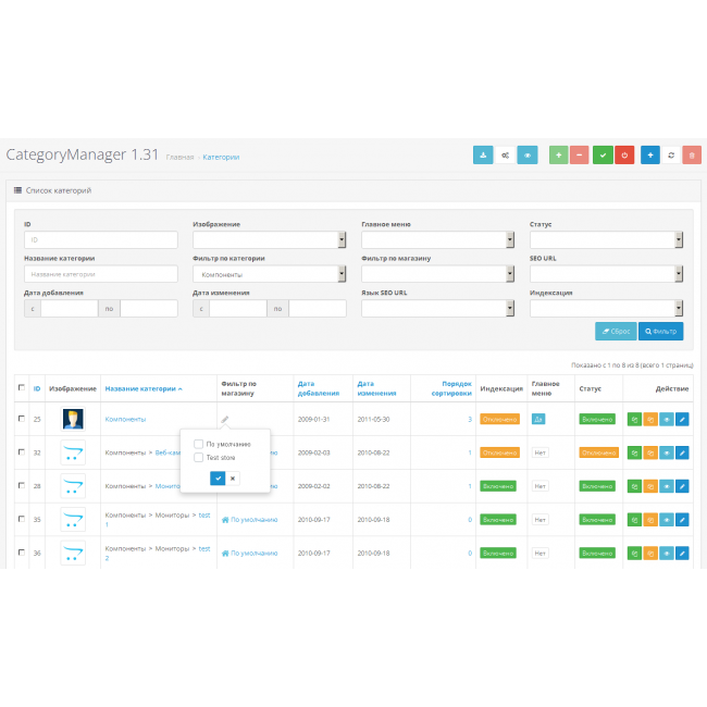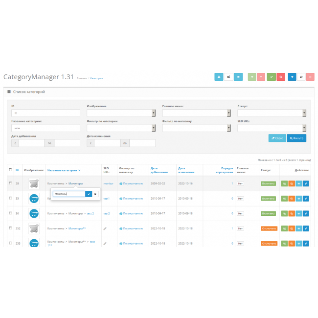 доступно изменение изображения, названия категории, seo-url, привязки к магазинам, порядок сортировки, быстрая смена статуса и показа в главном меню *