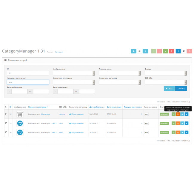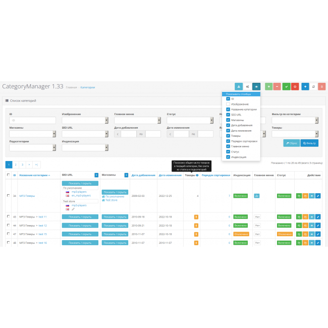 - возможность быстрого скрытия / показа нужных колонок в списке категорий модуля