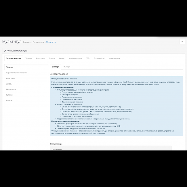 - Импорт товаров- Массовая загрузка и обновление данных о товарах из Excel с поддержкой нескольких языков, категорий, изображений и других атрибутов.