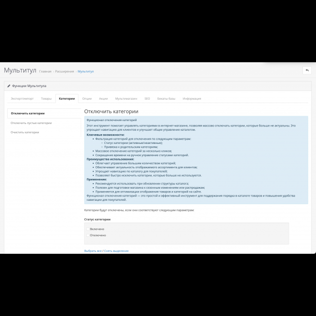 - Удаление категорий из магазина- Массовое удаление привязки категорий из магазина.