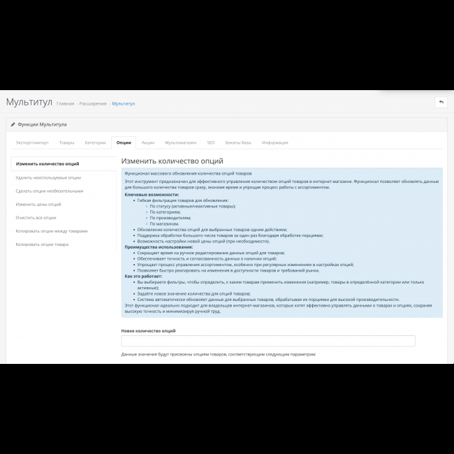 - Удаление определённых опций- Выборочное удаление заданных опций из товаров с учетом установленных фильтров.