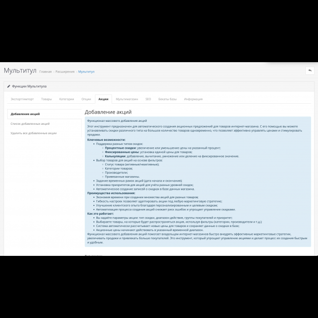 - Массовое добавление акций- Автоматическое создание акционных предложений для товаров с разными типами скидок (процентные, фиксированные, арифметические операции) и заданием временных рамок и приоритетов.