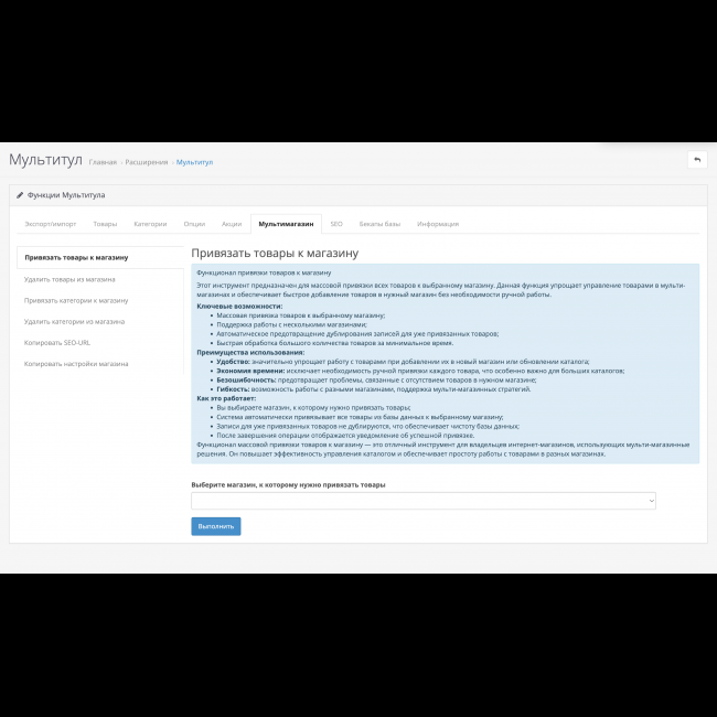 - Массовая привязка товаров к магазину- Автоматическая привязка всех (или выбранных) товаров к заданному магазину в мульти-магазинной системе.