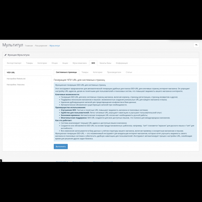 - Генерация SEO-URL для товаров- Автоматическая генерация поисково-оптимизированных URL для товаров на основе их названий с проверкой на дубликаты и поддержкой нескольких языков и магазинов.