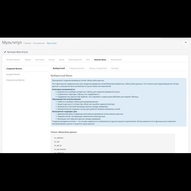 - Полное резервное копирование базы данных товарного каталога- Резервное копирование всех таблиц, связанных с каталогом товаров (категории, товары, атрибуты, опции, фильтры, производители, отзывы и пр.).