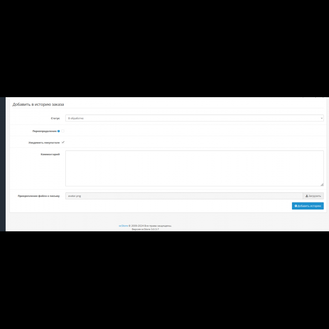 Модуль расширяет функционал Истории заказа Opencart 3.x - добавляет возможность админу прикреплять файл к истории заказа и отправлять его