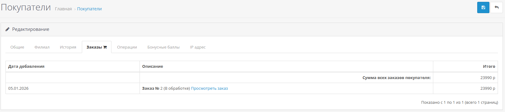 Добавлена возможность просмотреть заказ покупателя из карточки покупателя, а также указывается сумма всех заказов покупателя.