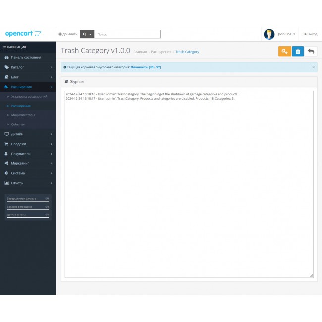 И так принцип работы модуля - одна (корневая) категория помечается как «trash», как следствие, все её подкатегории и товары получают соответствующий признак. Модуль позволяет, как вручную (нажатием одной кнопки), так и по заданию CRON (по расписанию), отключить на сайте товары и категории помеченные «trash». В итоге «trash-контент», так же как, и «trash категории» на сайте для обычного пользователя не отображаются, но доступны для администрирования через инструменты опенкарта.