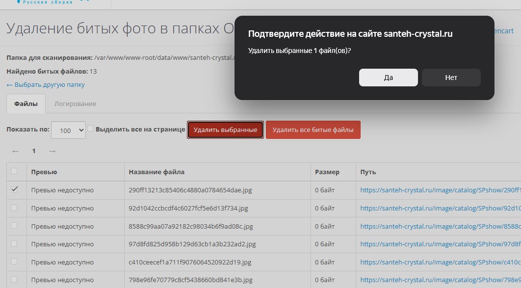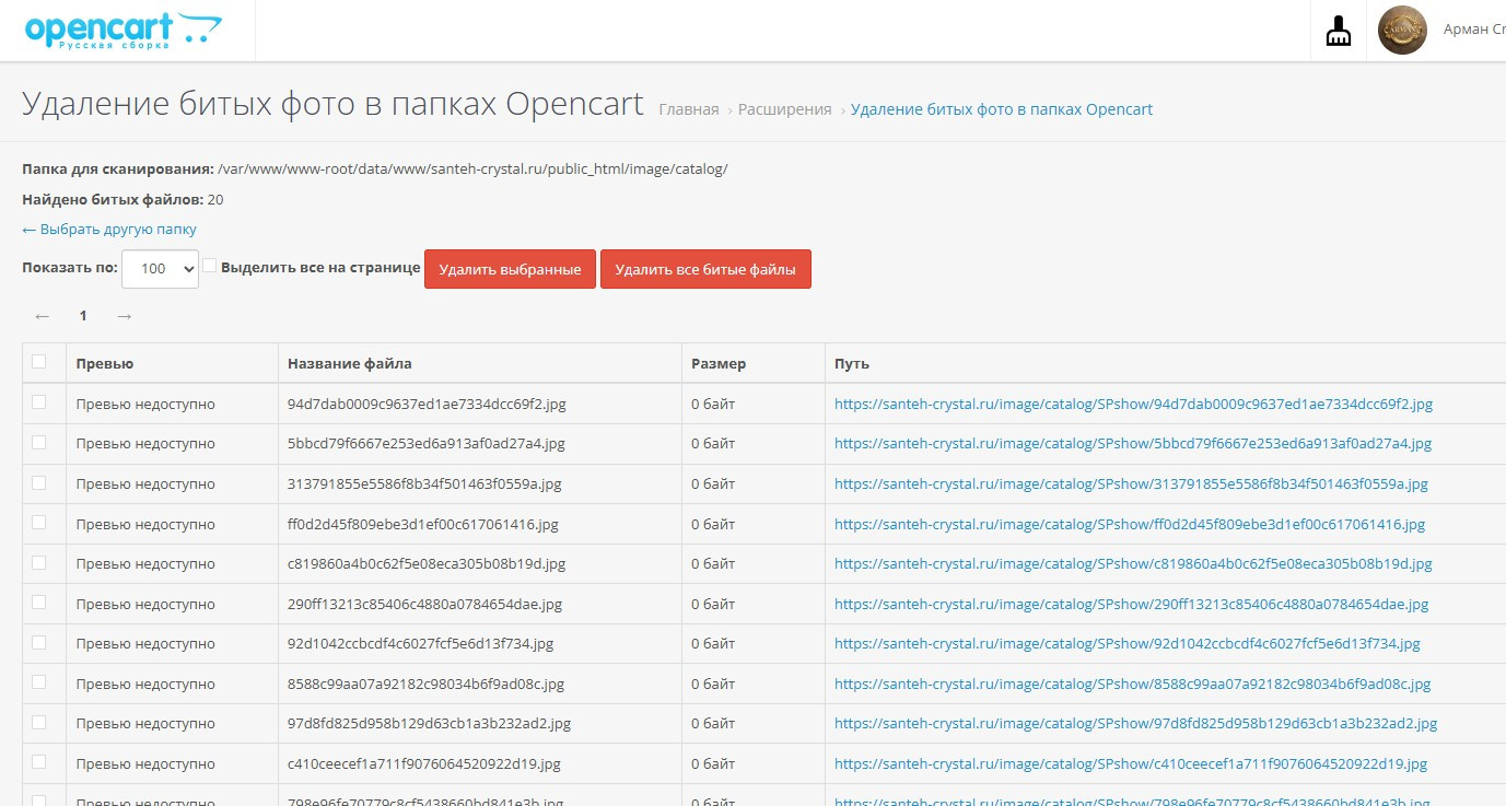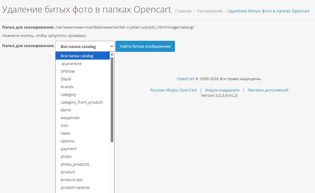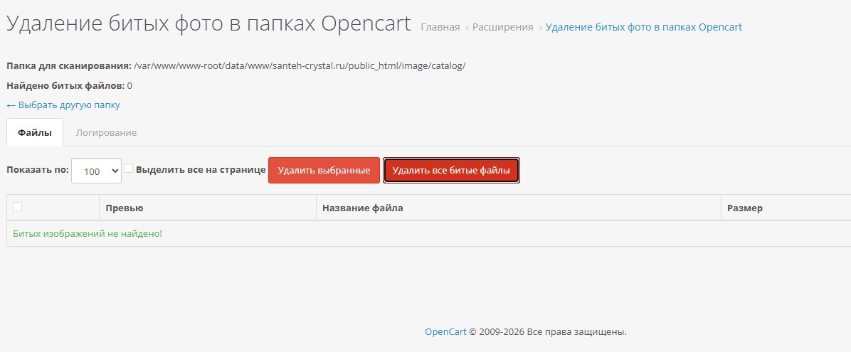 image/catalog вашего магазина OpenCart, идентифицируя все «битые» или не отображающиеся фотографии. После обнаружения таких изображений модуль предоставляет возможность их безопасного удаления. Таким образом, вы легко избавитесь от ненужных файлов, которые занимают место на сервере и создают визуальный беспорядок на сайте.