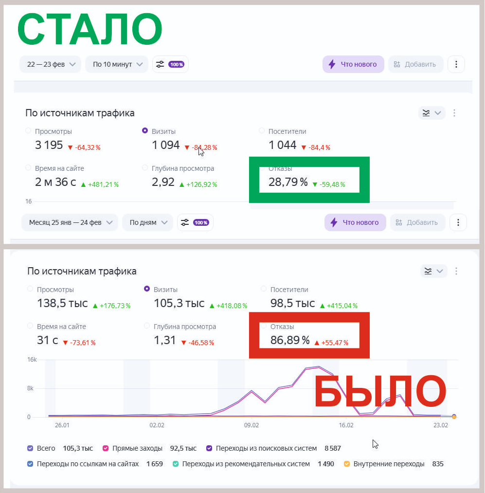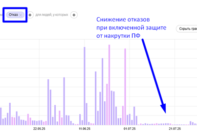 Снижение показателя отказов до 22-28% на второй день после внедрения. Устранение накрутчиков поведенческих факторов в течении недели