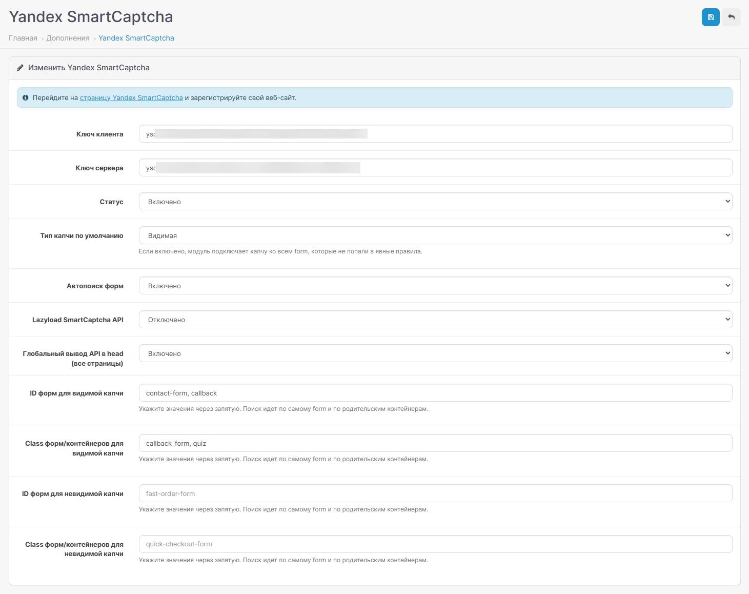- Простая настройка: Достаточно вставить ключи API и выбрать нужные формы в админке.