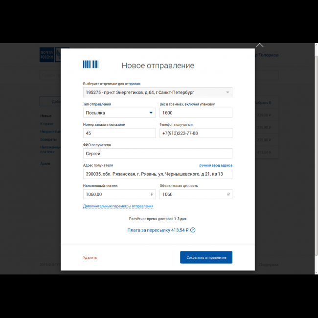 Нажимаем отправить и данные улетают на сервер Почты, а в магазине происходит смена статуса заказа.