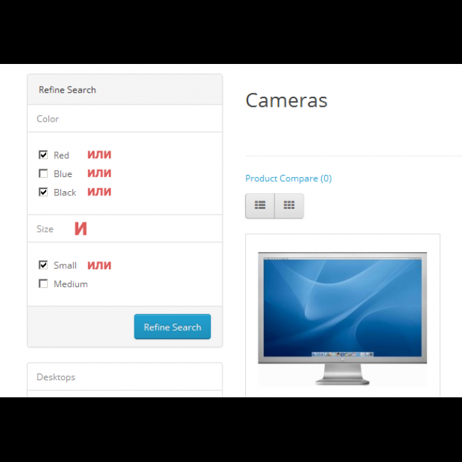 при фильтрации будут выбраны все товары, у которых совпадает ХОТЯ БЫ один параметр в фильтрах (без учета групп фильтров)