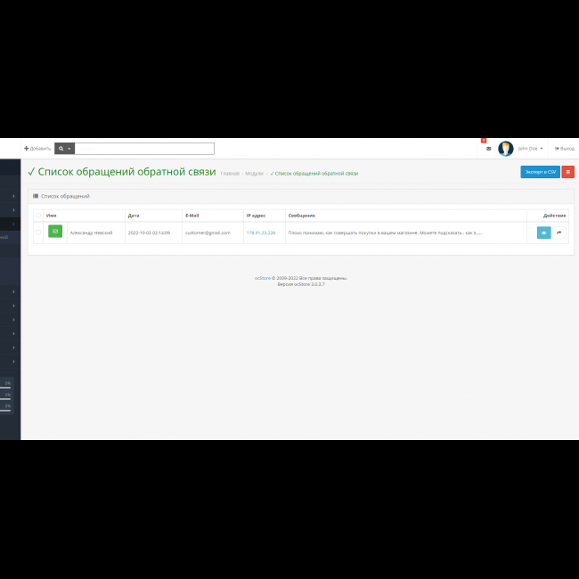 - После того, как покупатель отправит сообщение со страницы Связаться с нами, оно станет отображаться в общем списке всех подобных обращений на странице данного модуля.