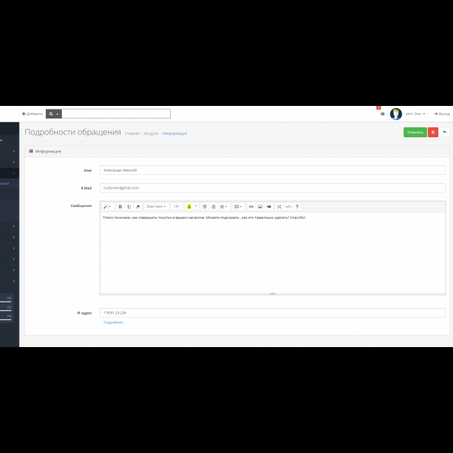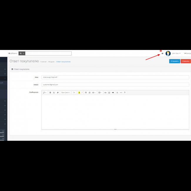 - Но самое удобное, вы сможете из админки магазина, ответить покупателю . Для письма от магазина предусмотрена поддержка HTML, таким образом ваше письмо не только будет более красивым, но и сможет содержать цитирование сообщения покупателя, ваш логотип и контакты, изображения, видео, карты итд, для того что бы дать покупателю наиболее развёрнутый ответ.