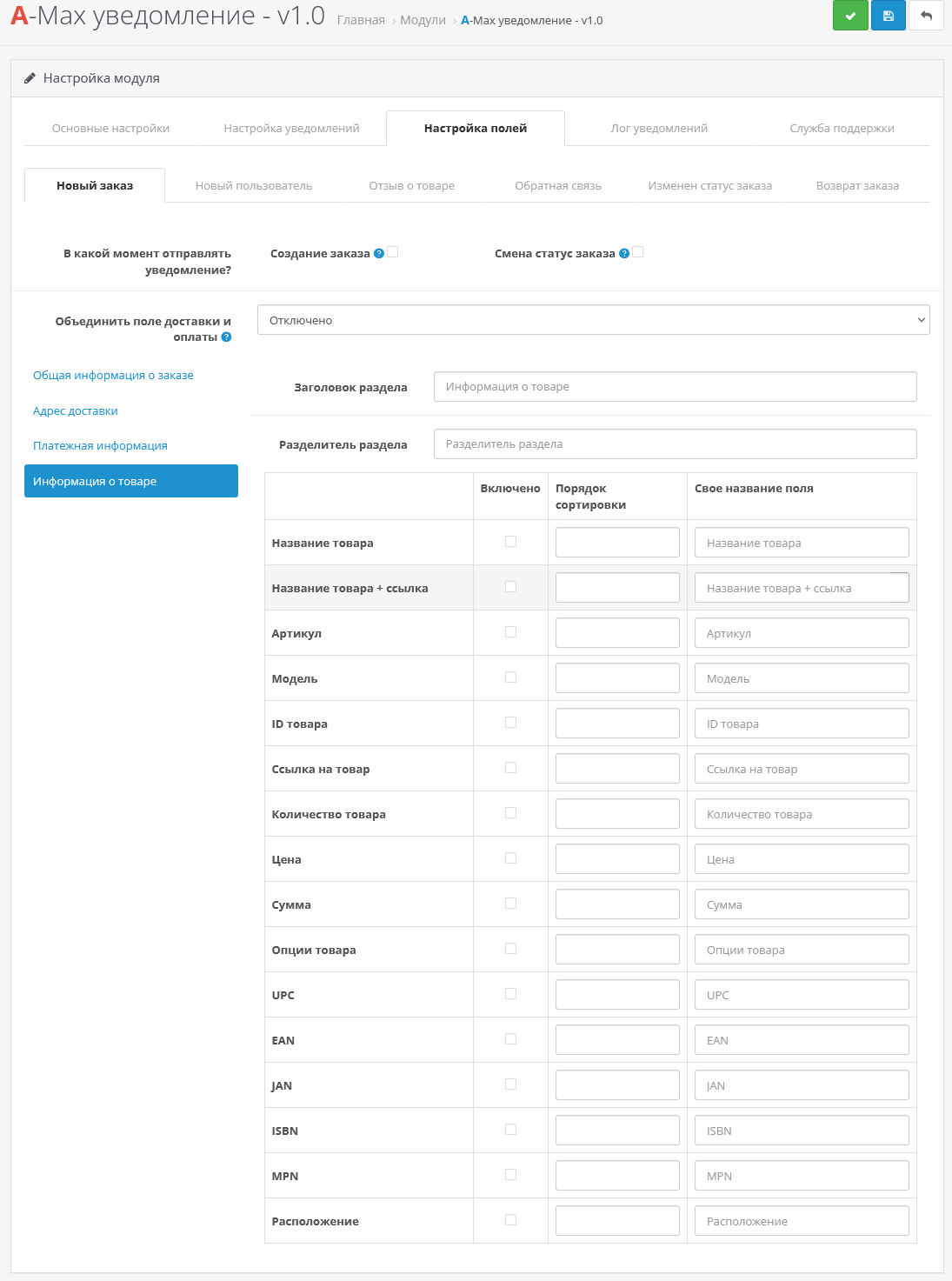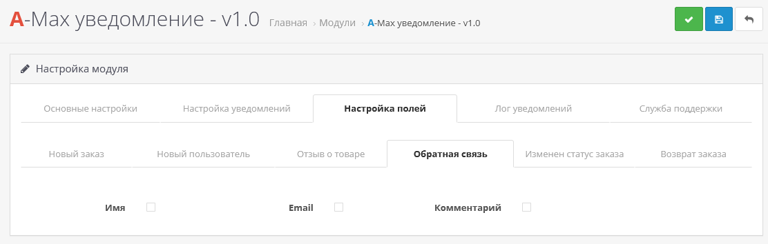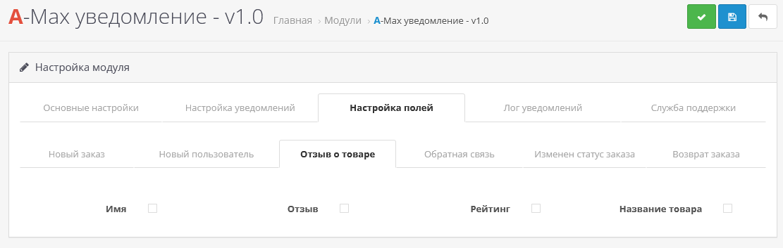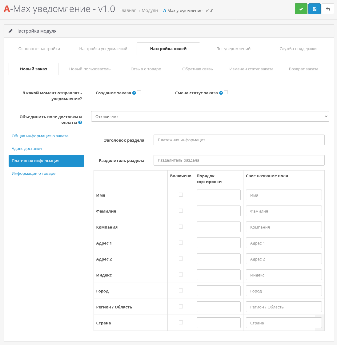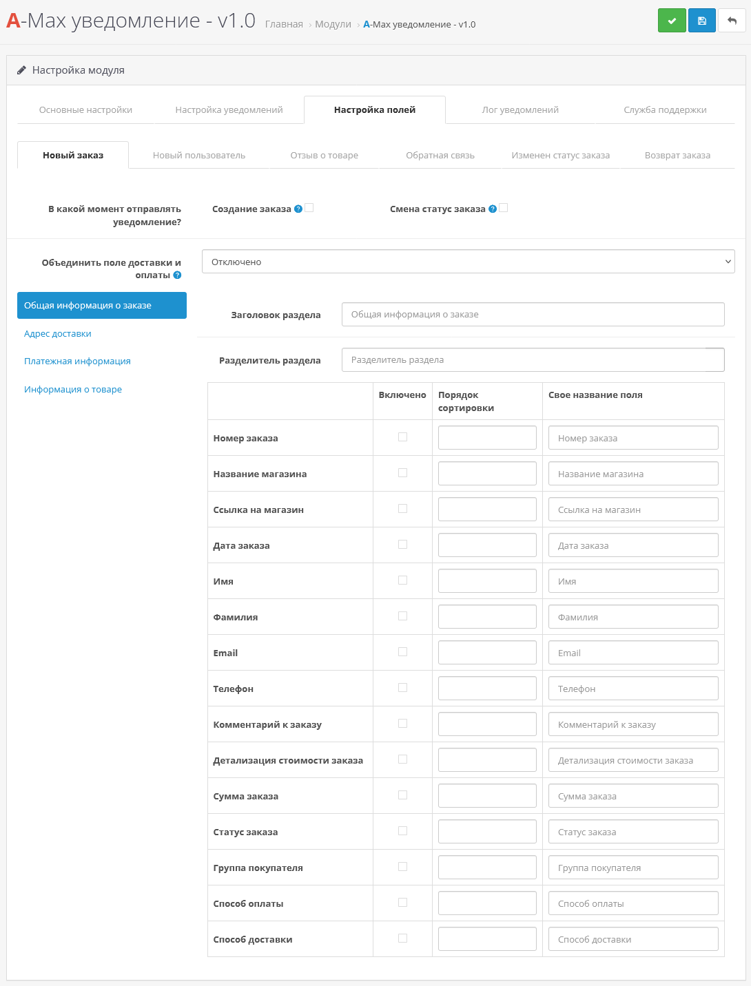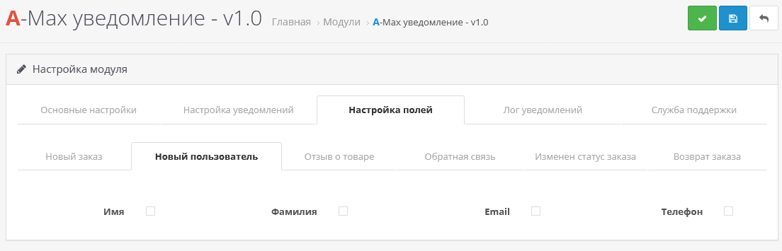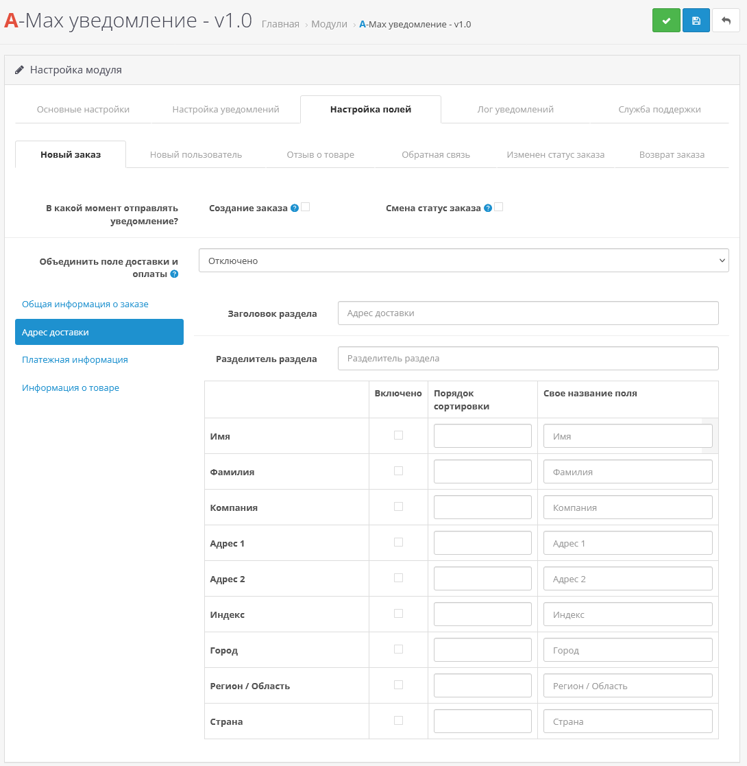 - Дальше отметьте галочкой поля, которые должны приходить в уведомлении и нажмите сохранить.