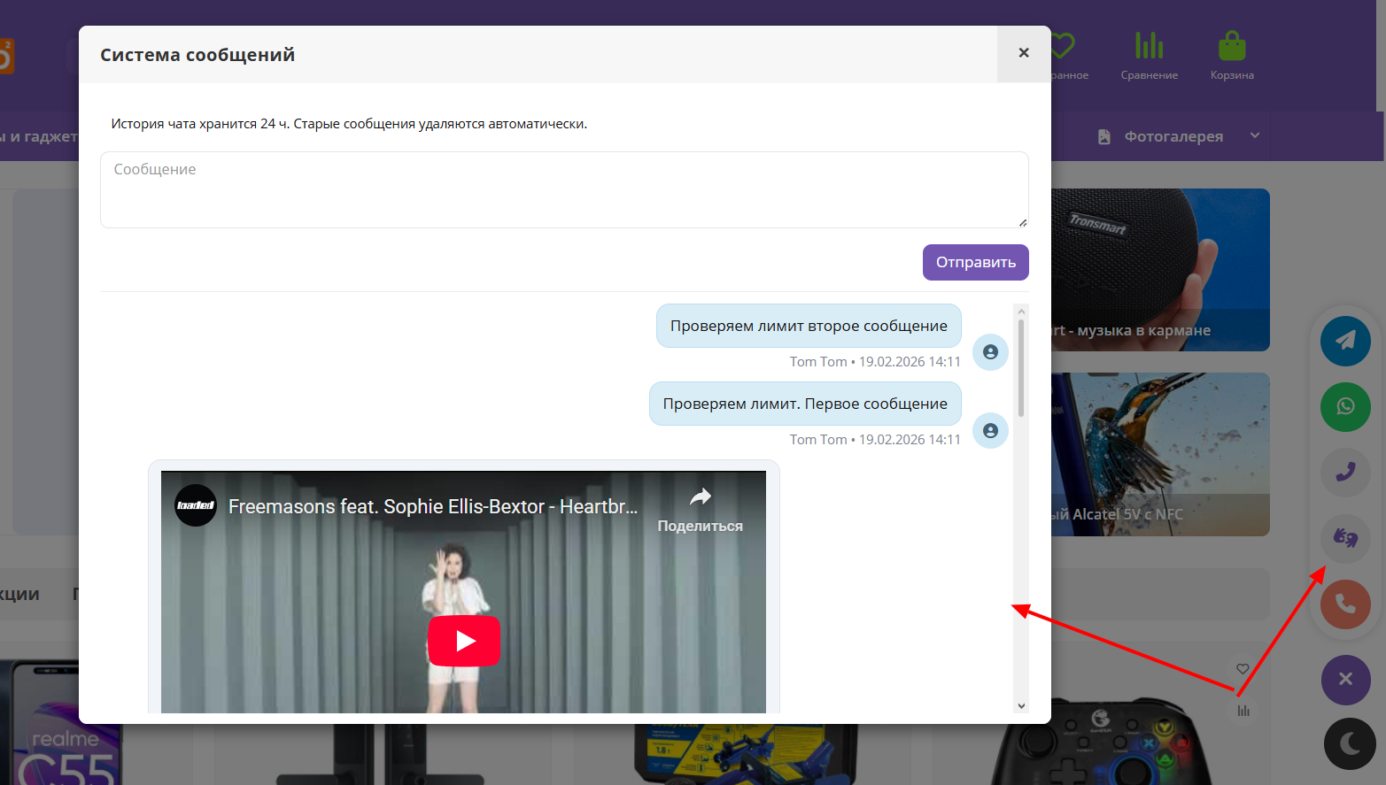 Покупатель пишет сообщение на витрине в модальном окне, администратор отвечает из панели управления.