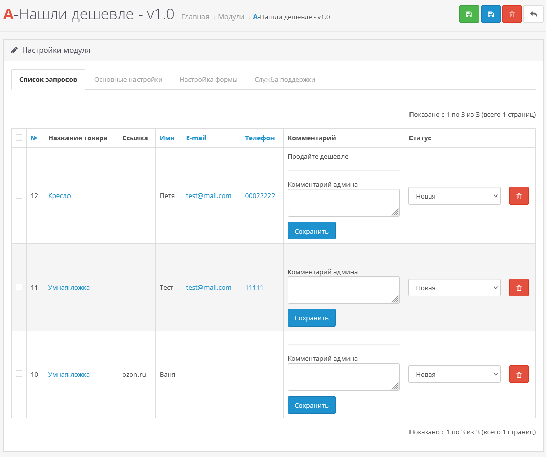 «Нашли дешевле» помогает магазину не терять клиентов, которые находят товар по более привлекательной цене на другом сайте. Покупатель нажимает кнопку, оставляет контактные данные и ссылку на конкурента — заявка сразу появляется в панели администратора.