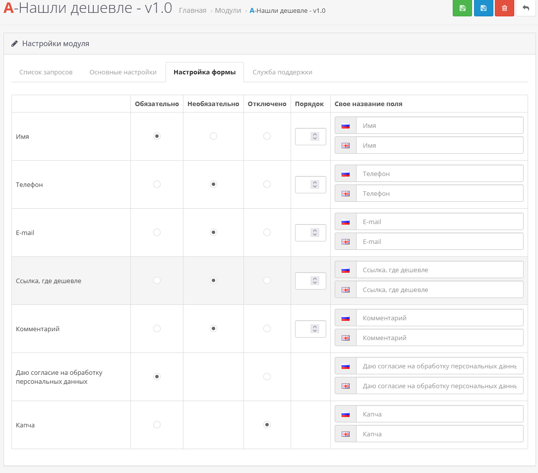 Вы сами управляете полями формы: можете включать или выключать их, менять порядок, задавать собственные названия и выбирать, какие будут обязательными. Поддерживается многоязычность.