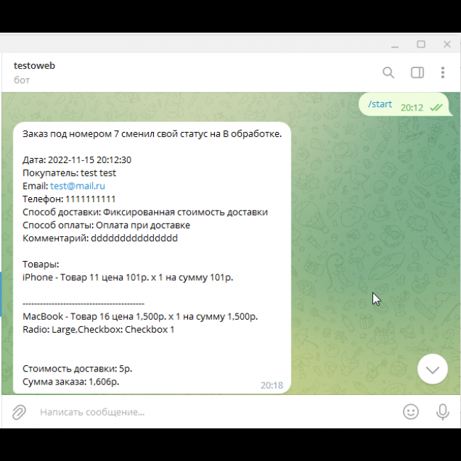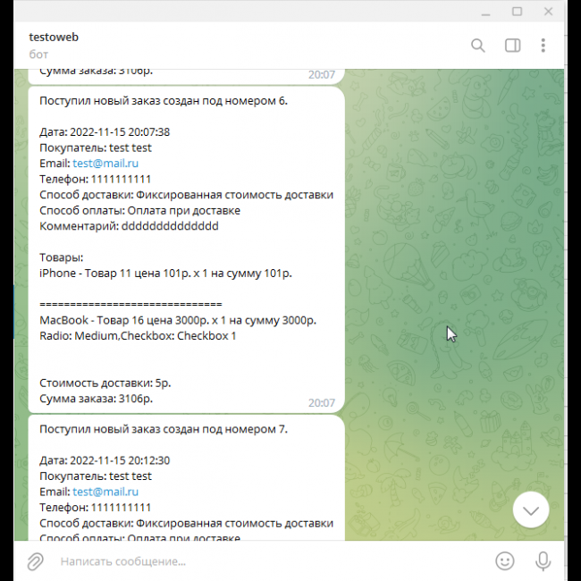 11) Теперь при создании нового заказа, администратору будут приходить сообщения с информацией о заказе по настроенному шаблону.
