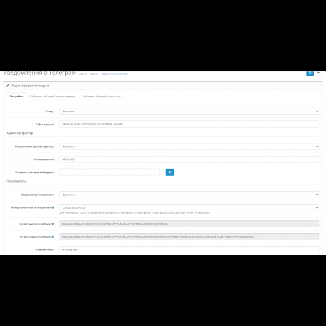 4) Войти в настройки модуля в Дополнения - Модули - Уведомления в Телеграм , установить и выставить необходимые настройки.