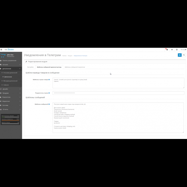 Администратор может получать уведомления при новом заказе в Telegram. Покупатель может получать уведомления при смене статуса заказа, если при оформлении заказа подписался на такие уведомления. Модуль не перезаписывает файлы движка или шаблона. Используются модификаторы ocmod и vqmod.