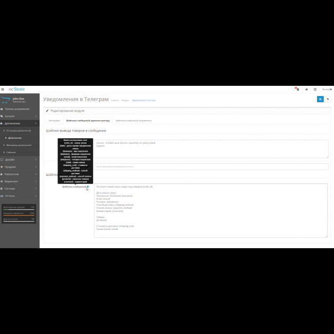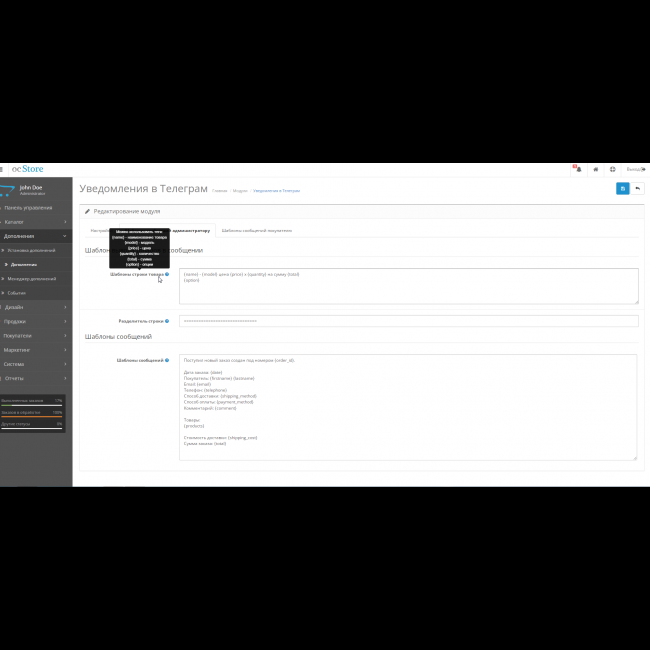 6) На вкладке "Шаблоны сообщений администратору" в поле "Шаблоны сообщений" задайте шаблон письма, при этом можно использовать динамические теги (они указаны в подсказках при наведении на вопросик). При указании таких тегов они будут заменяться информацией из заказа. Например "Вам поступил заказ № {order_id}". {order_id} в сообщении будет заменен на реальный номер заказа.