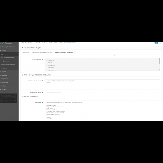 Модуль Оповещения о заказах в Telegram позволяет получать сообщения о поступившем заказе в Telegram, а также уведомлять клиента о смене статуса заказа. Есть возможность создать шаблоны сообщений покупателю и администратору.