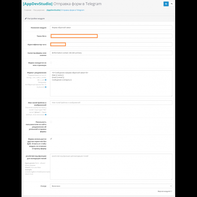 8. Нажмите на кнопку редактирования [AppDevStudio] Отправка форм в Telegram, введите данные формы, токен бота и идентификатор чата и нажмите Сохранить.