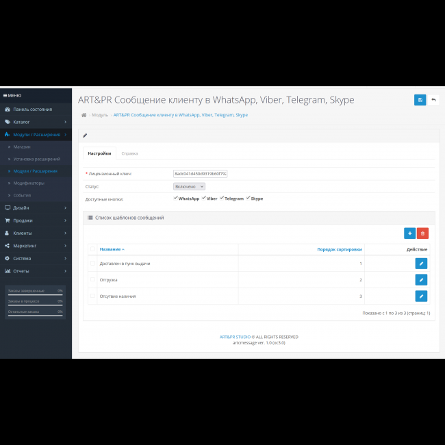 Отправка сообщений покупателям в Whatsapp, Viber, Telegram, Skype.