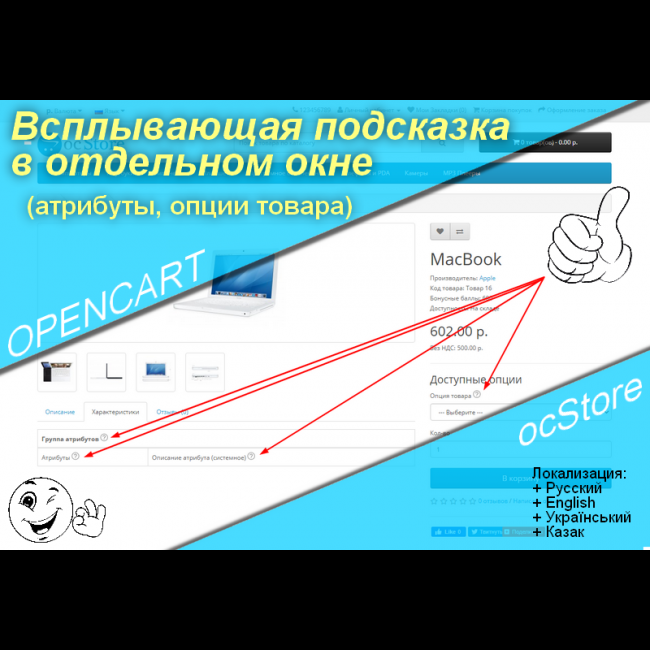 Данный модуль облегчает покупателю подробно ознакомиться с описанием характеристик товара, группы атрибутов товара, атрибутов товара или опций товара. Посредством вывода знака вопроса после надписи названия опции , названия