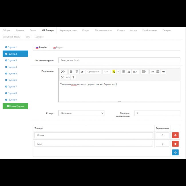 Возможность создать группу для товаров и добавить туда выбранные товары + сортировка