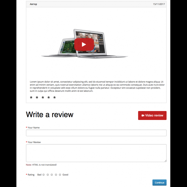 Модуль позволяет записывать и выводить видео отзывы к товарам. Для корректной работы модуля необходима установка https на сервере.