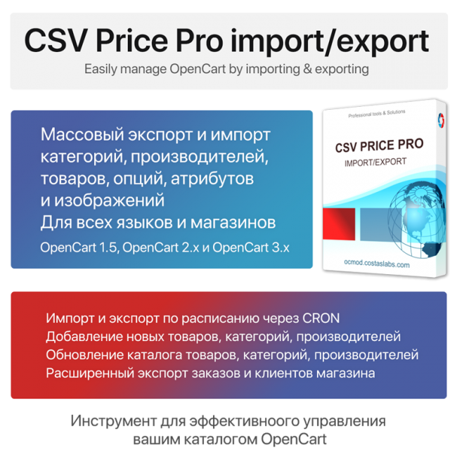 Этот инструмент представляет собой профессиональное решение для импорта и экспорта товаров через файл CSV.