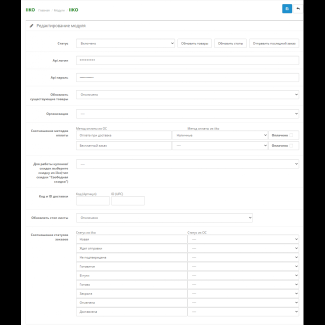 4. В настройках модуля указать логин и пароль API, сохранить, выбрать организацию, сохранить.