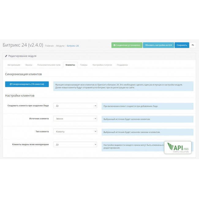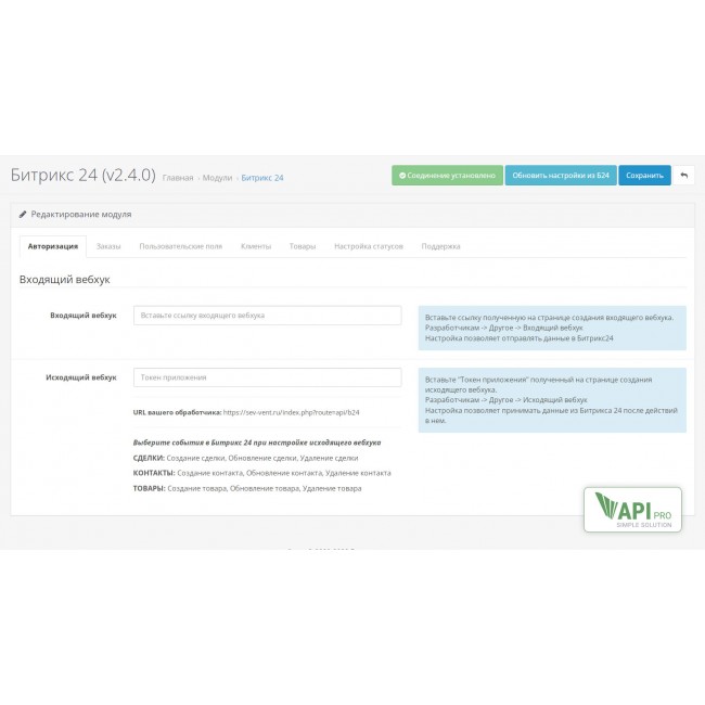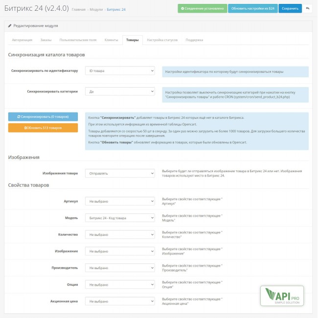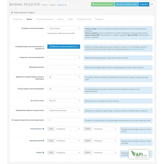 У нас уже полным ходом шла работа по наполнению товарами и сео оптимзации магазин AoLife.ru на Open Cart 3 версии Version 3.0.3.3. Посчитайте какие трудозатраты + дополнительные расходы по внедрению Битрикс 24 а это ещё + от 100 тр . короче говоря мы приуныли. Немного успокоившись и оглядевшись в поисковиках нам попадается решение нашего вопроса это Модуль обмена Opencart + Битрикс24. Цена как минимум в 10-20 раз ниже ожидаемых расходов. Соблазн велик, соотношение риска напрасно потратить деньги тает по мере прочтения отзывов. Покупаем и что бы ничего не испортить сразу связываемся с разработчиком ( профи своего дела по 10 бальной шкале ставлю 15 ????). Покупка и интеграция проходила в выходные дни и это не повлияло на оперативность работы службы тех поддержки