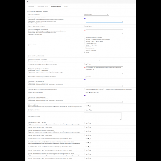 - Возможность использования инструкции к оплате при оформлении заказа (использование переменных таких как «номер заказа», «ссылка на оплату»,
