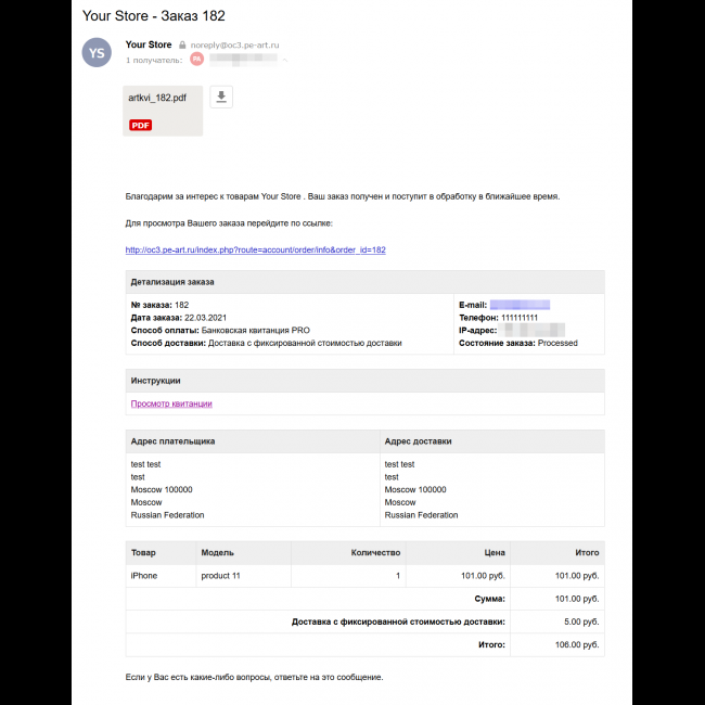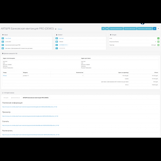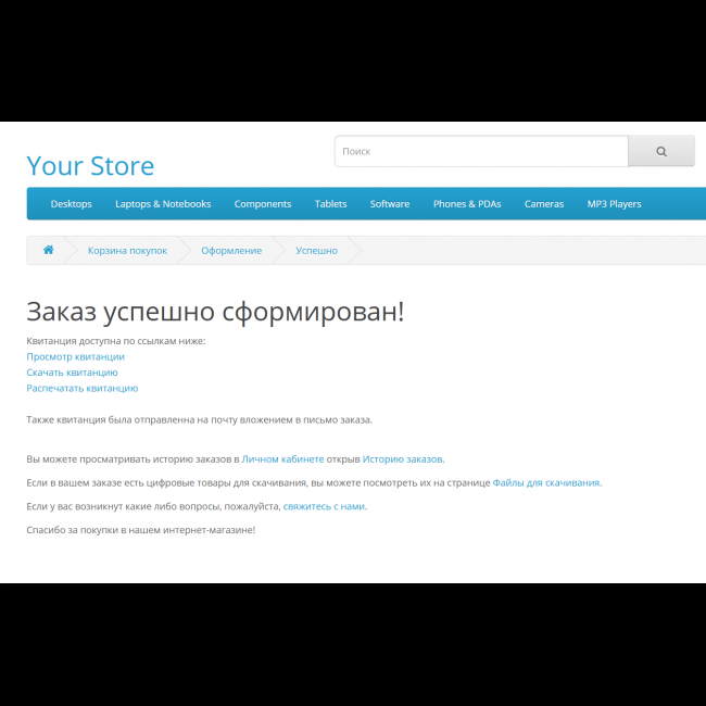 - На странице оформленного заказа, ссылки на просмотр, скачивание и печать квитанции или возможно в настройках задать Ваш текст и ссылки.