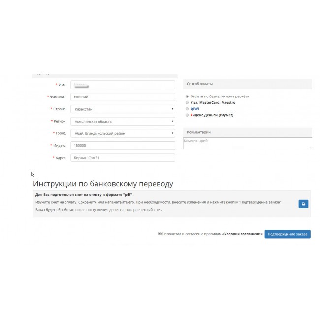 Если при оформлении заказа будет выбран способ оплаты "Безналичный расчет", то модуль сформирует счет на оплату и предложит покупателю его распечатать.
