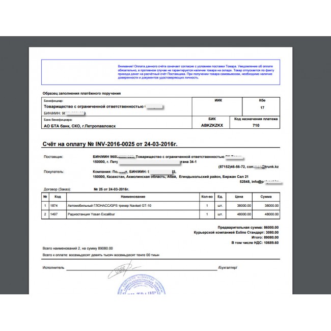Платежный модуль для подготовки счета на оплату в формате pdf. Форма счета на оплату соответствует требованиям бухучета РК