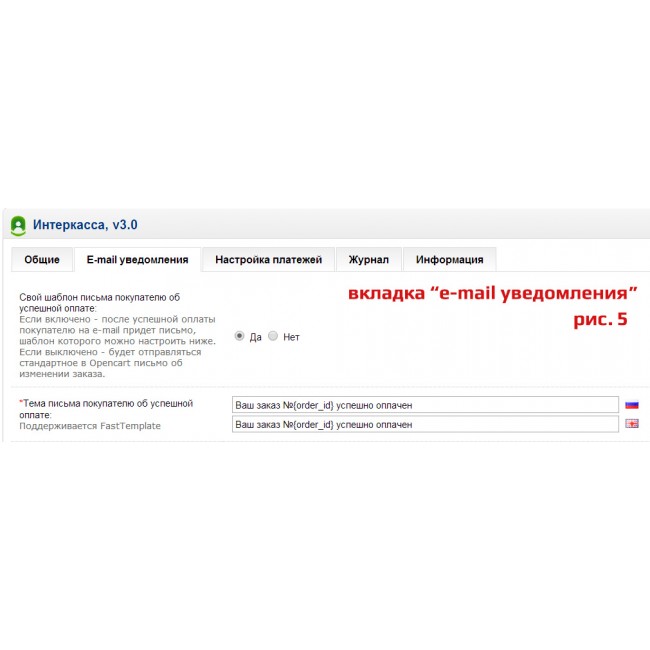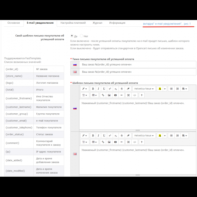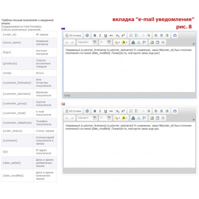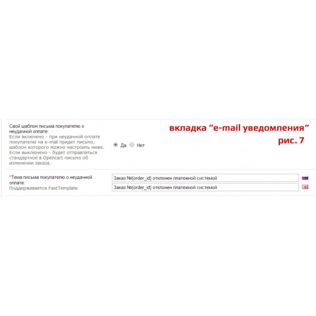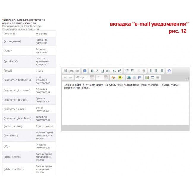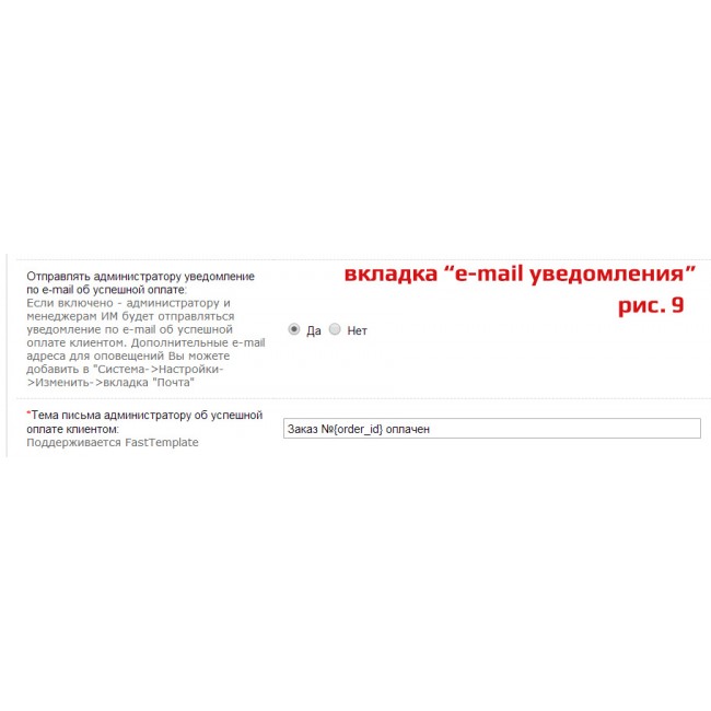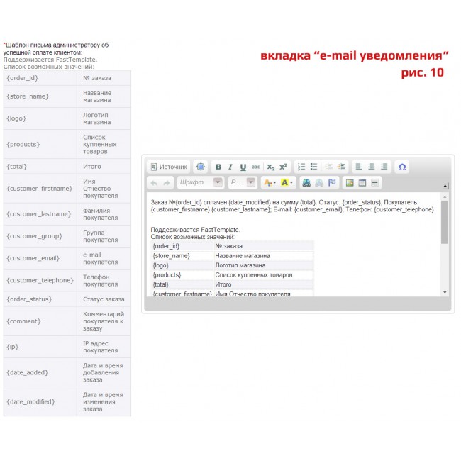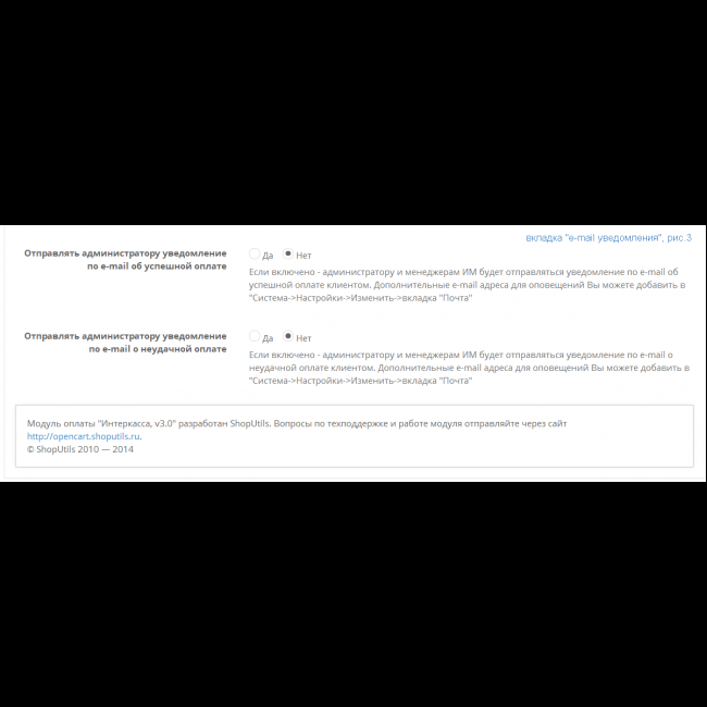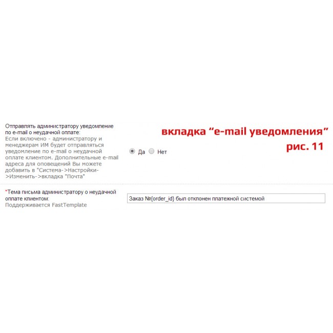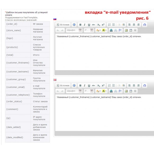 - Управление шаблонами e-mail оповещений о результатах оплаты покупателей и администраторов интернет-магазина;