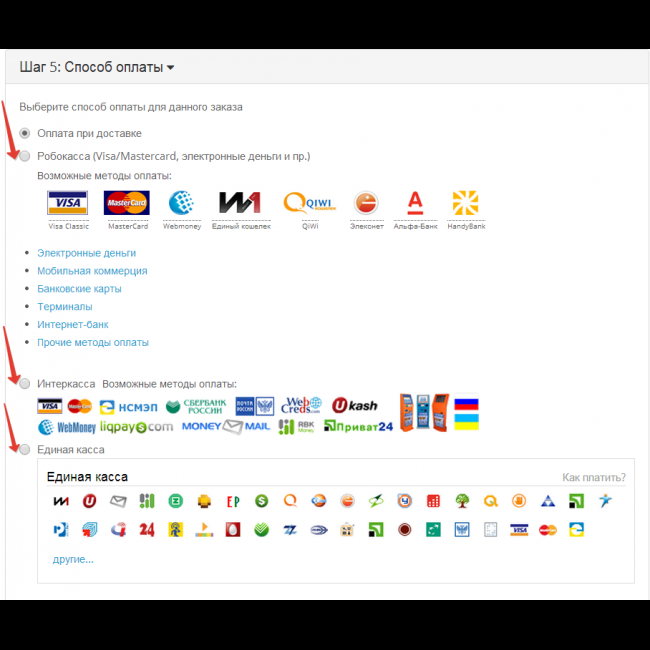 - Вывод всех возможных методов оплаты в виде иконок, на странице оформления заказа;