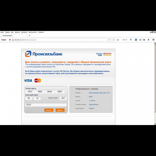 интернет-эквайринг Промсвязьбанка (банковские карты Visa и Mastercard).