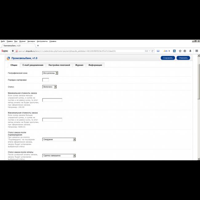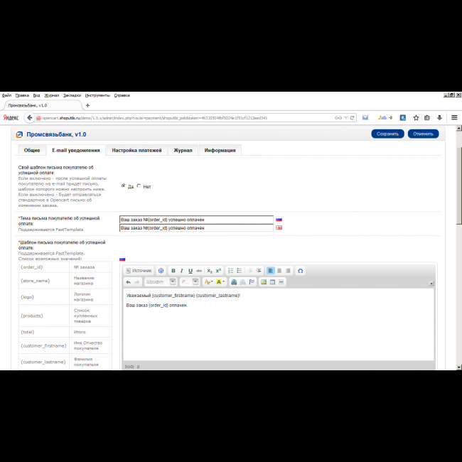 - Управление шаблонами e-mail оповещений о результатах оплаты покупателей и администраторов интернет-магазина;