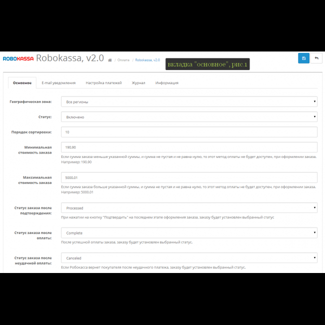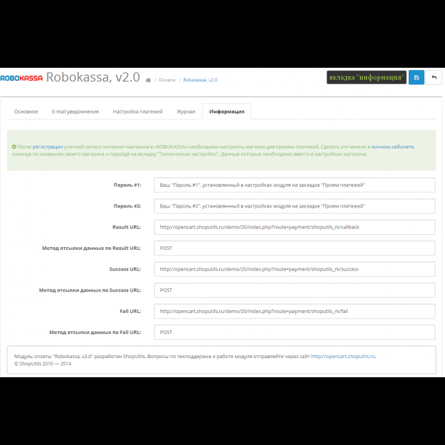 - Информация по настройке параметров робокассы на закладке "Информация";